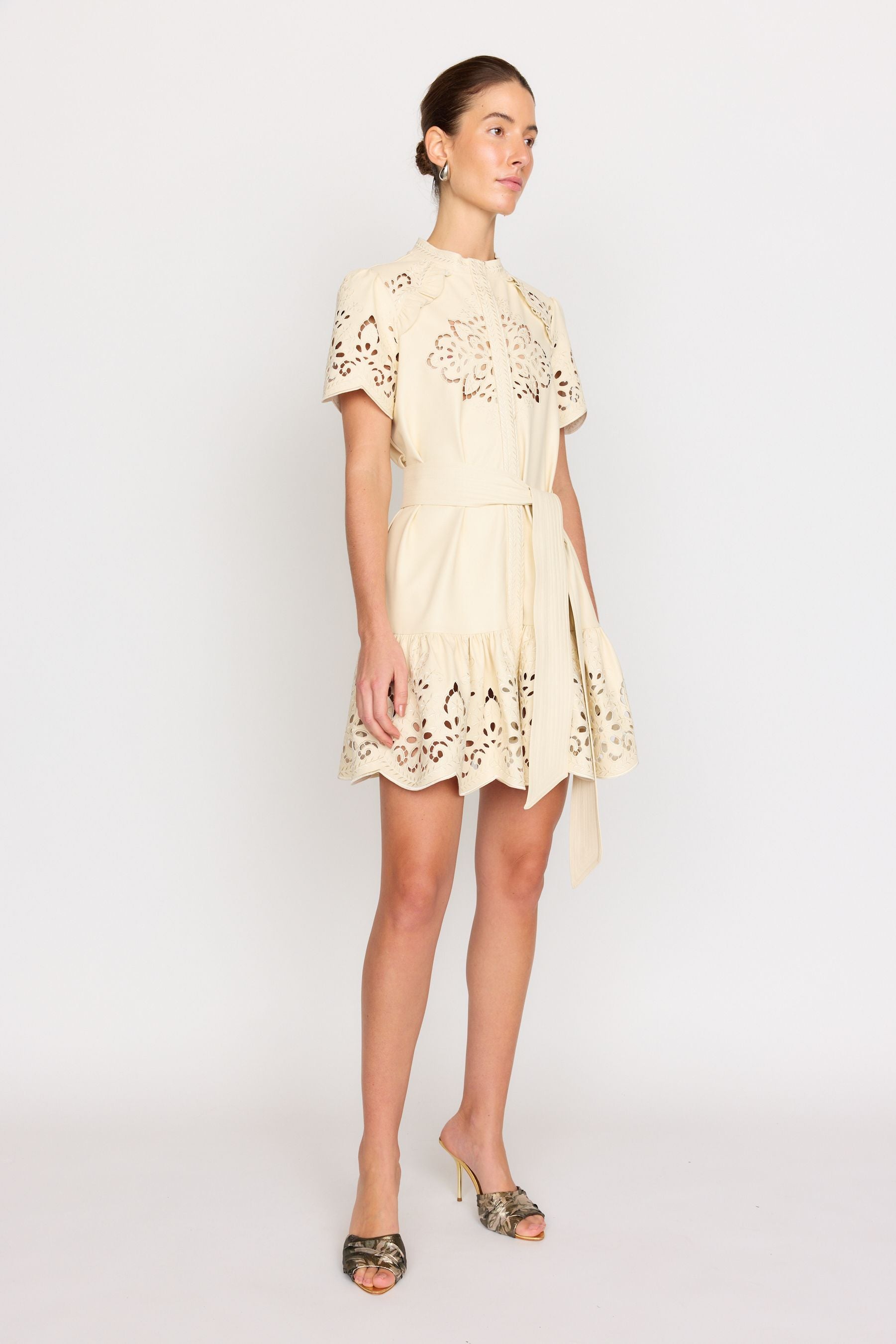 Crafted in our vegan leather, the Carrie dress is a classic silhouette reimagined with modern floral embroidery. The dress has a feminine short sleeve with a drop-waist, single-tier skirt. It is complete with a trapunto-stitched self-tie belt, snap closures at the front placket, and a matching slip.
