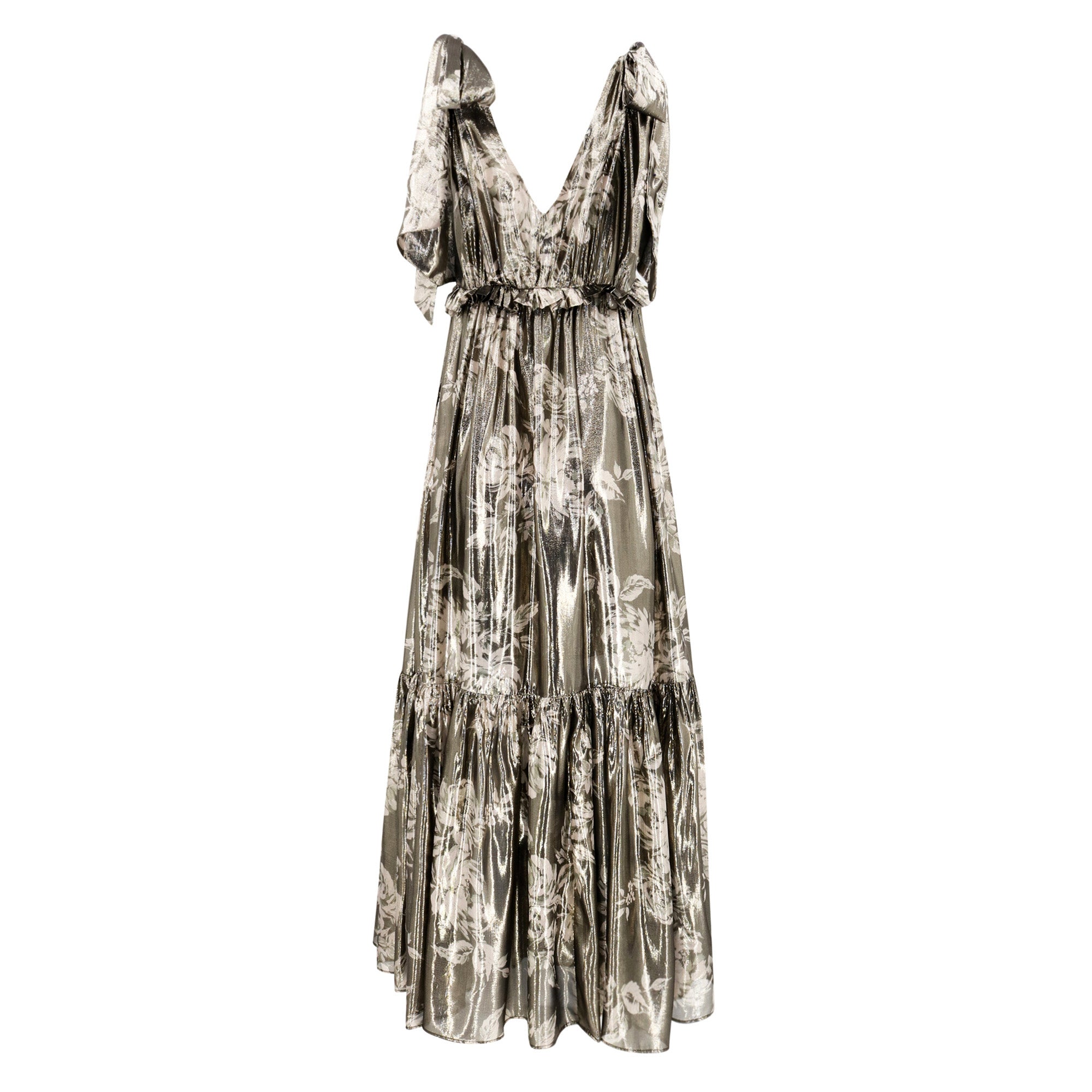 This romantic, occasion-ready Paris Dress is cut in a chic lamé fabrication, catching the light with a subtle metallic shimmer which adds an element of glamour. This floor-length dress features a plunging v-neck mirrored at the front and back, while the flowing fabric creates a dramatic and graceful silhouette. It is finished with delicate self-tie bow details at the shoulders and has an invisible side zipper for closure.